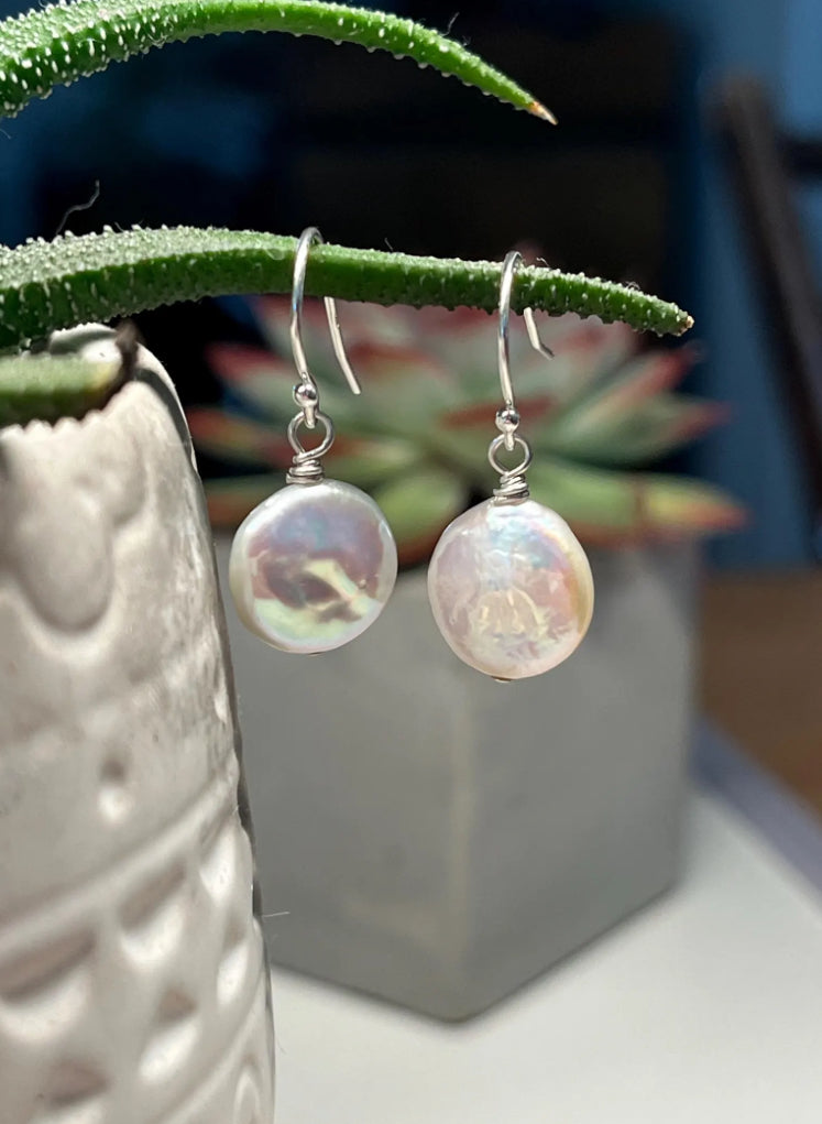 Elevate your everyday look with these classic coin pearl earrings by Bethany. Handcrafted in Cape May, these freshwater pearls are set in either sterling silver or 14 kt gold fill for a premium touch. Perfect for any occasion, these earrings are an essential addition to your jewelry collection.
