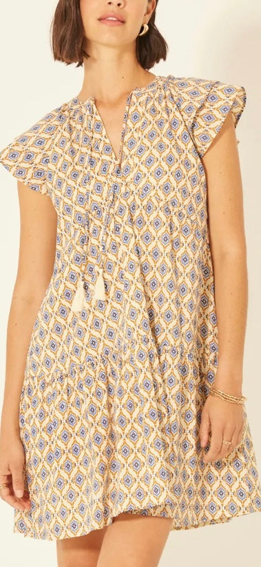 Gorgeous fully lined cotton dress, perfect for high summer but in a brown and blue print that carries you into fall. Pair with a denim jacket or blue or brown cotton cardigan!