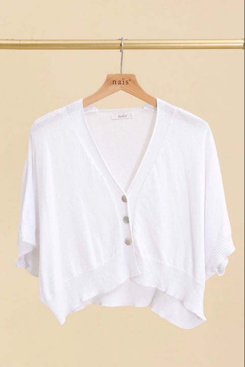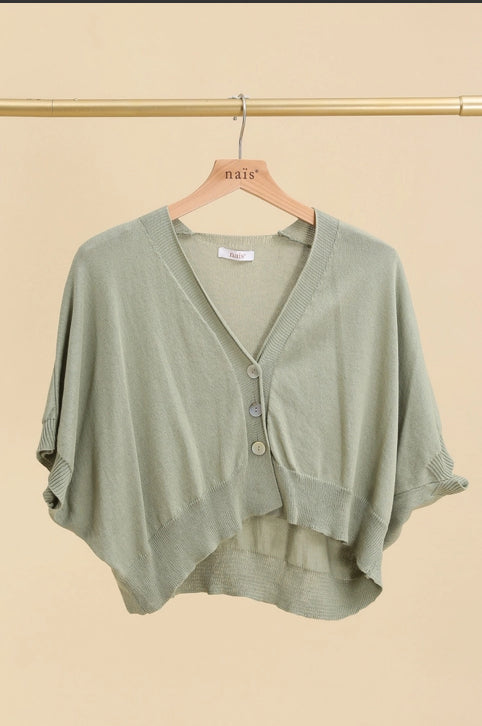 100% lightweight cotton cropped cardigan with delicate shell buttons. Designed in France, made in Italy. This is a thin cropped cotton sweater, not sweatshirt material and it is on the more elevated side because of that. It can easily be worn ( open or buttoned)as a top but is also the perfect cover up for any dress, from casual to black tie. It is one size fits most and because of the draping looks great on most sizes, including larger chests. We also have one each left in true white and also sage green, as pictured