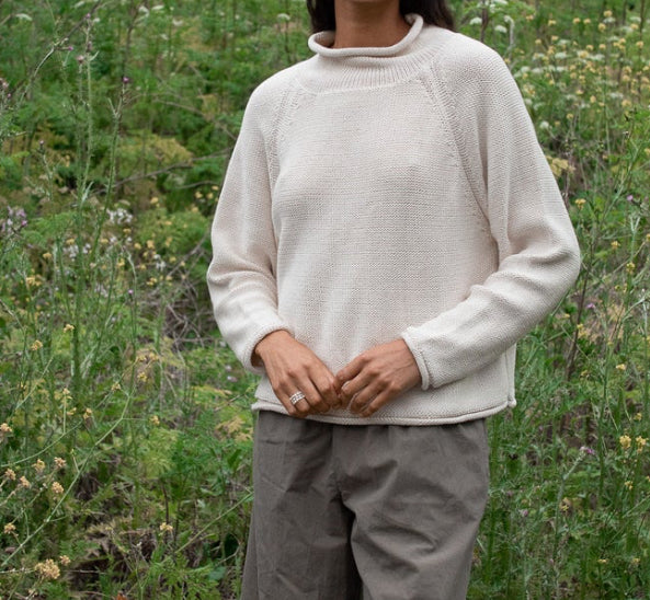This rollneck sweater was inspired by styles that are decades old and is a utility piece turned chic. It features delicate rolls at the wrists, neck, and waist, and is a mid-weight knit making it wearable in any temp.