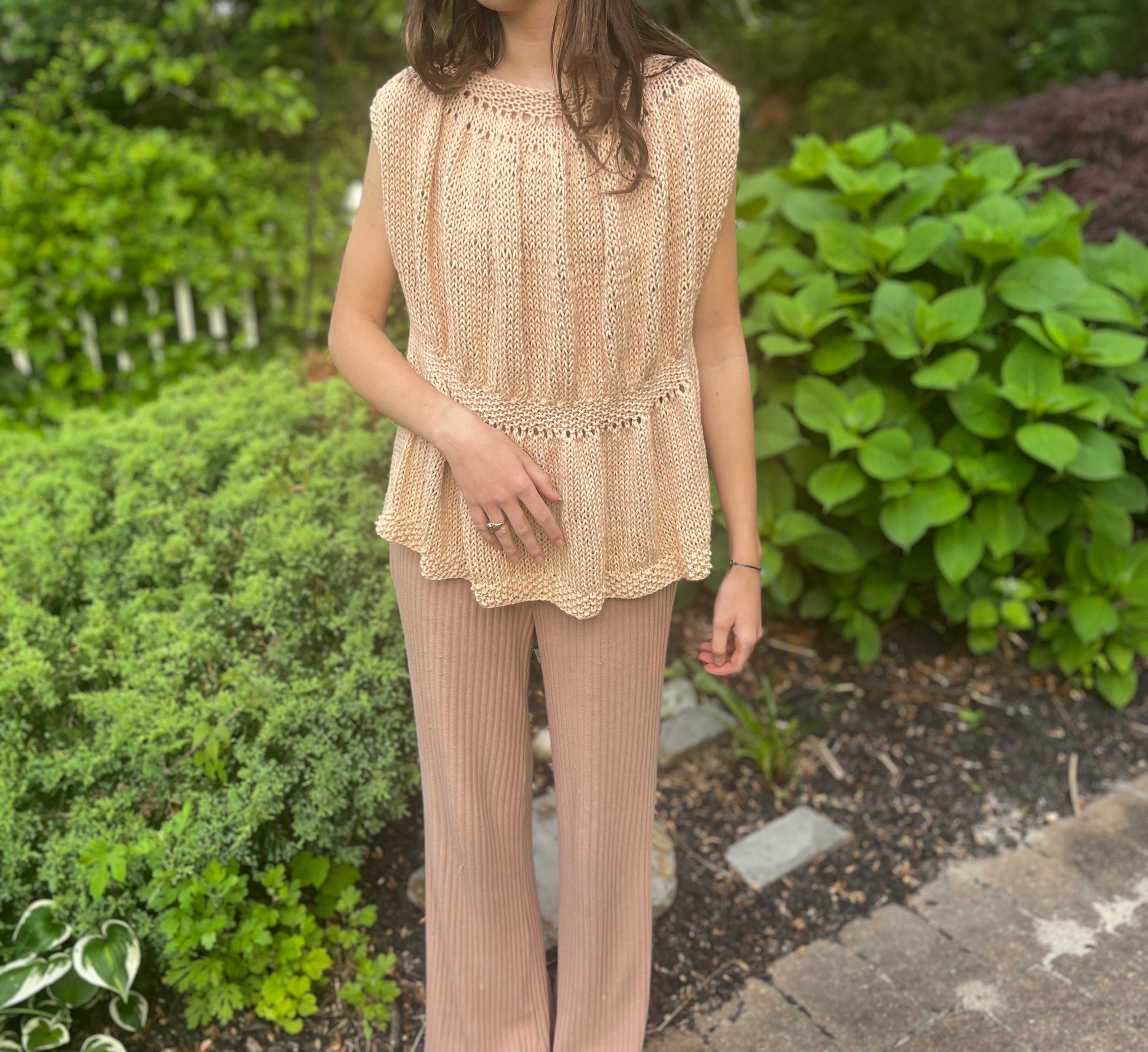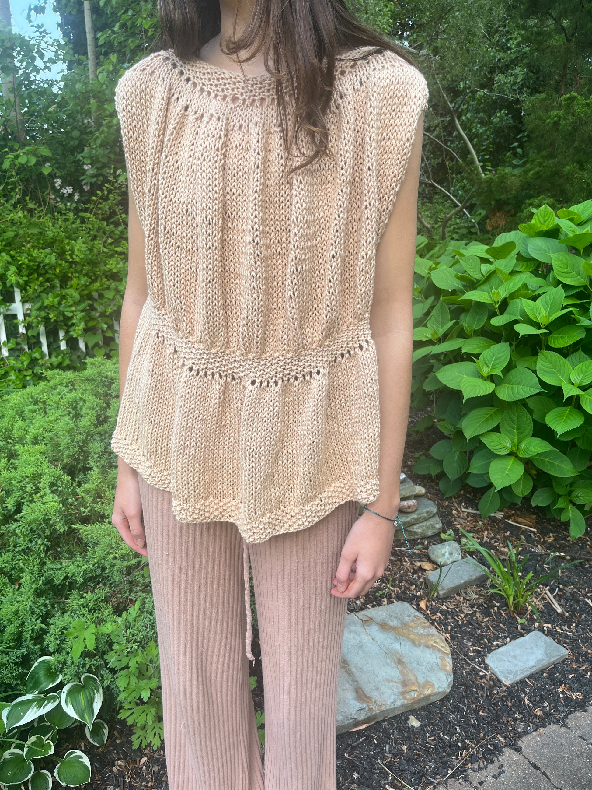 Hand knit by Mary with U.S. cotton, tea dye, one size